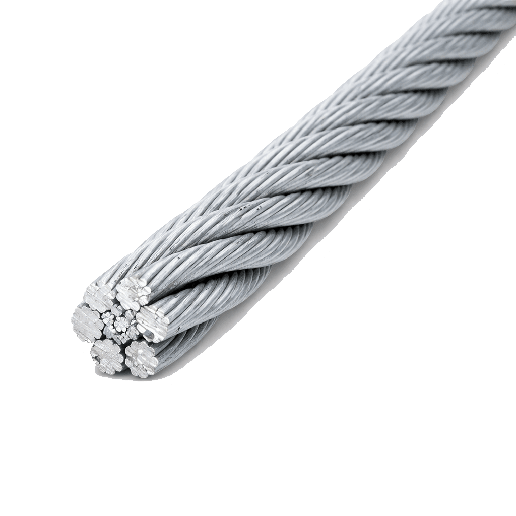 Cabo de aço galvanizado com alma de fibra ou aço. Alta resistência à tração e proteção contra corrosão para elevação, estaiamento e náutica.